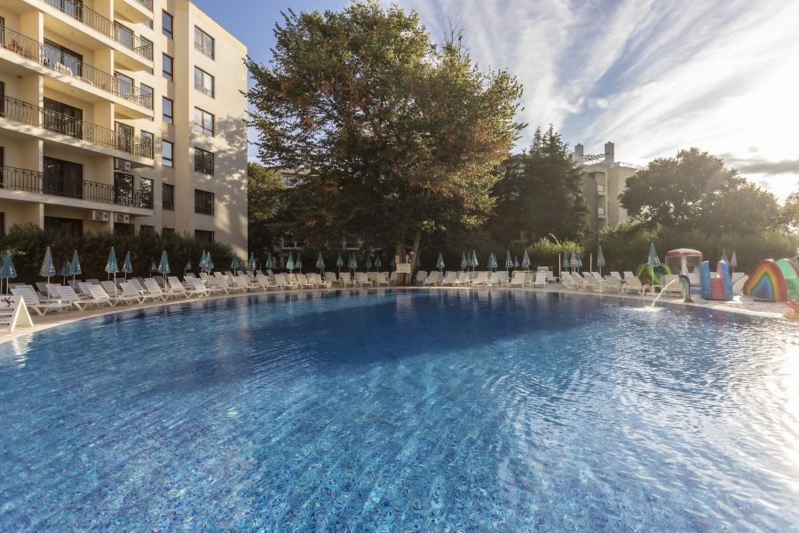 Открытый бассейн отеля с бесплатными шезлонгами и зонтиками идеально подходит для тех, кто предпочитает расслабляться и просто наслаждаться летними днями.